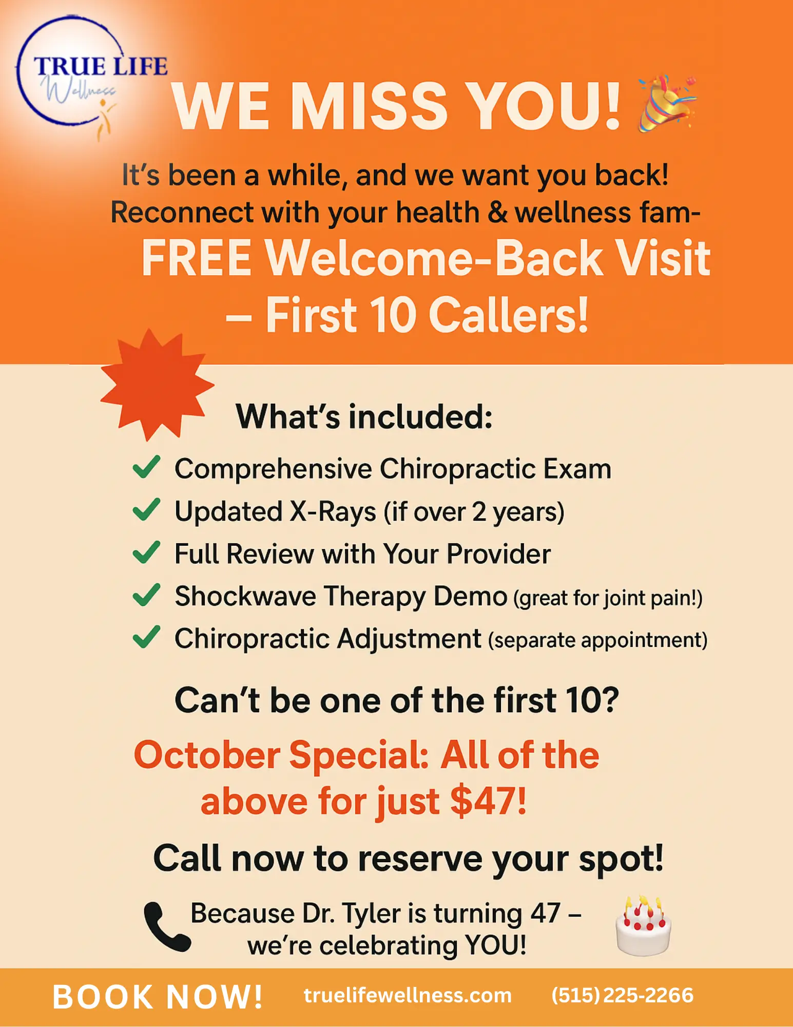 To celebrate your return, the first 10 patients to call will receive a FREE visit including:- Comprehensive chiropractic exam